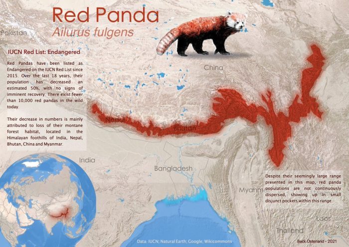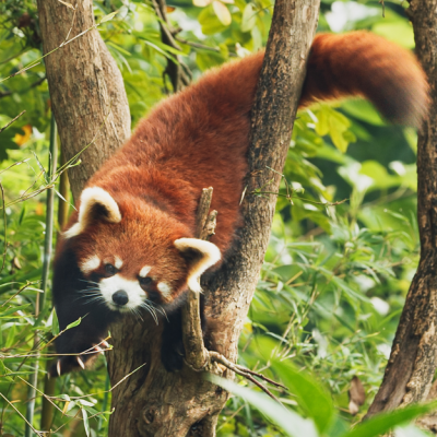 Red pandas are mostly herbivorous mammals of the order Carnivora, which are endemic to the Eastern Himalayas, between the heights of 2200 to 4500 meters, above sea level. They are evolutionary unique species as 83% of their diet consists of bamboo leaves and shoots, even though they evolved in from carnivore ancestors. Despite the name, they are not related to the Greater Panda of China but they did independently evolve similar features.